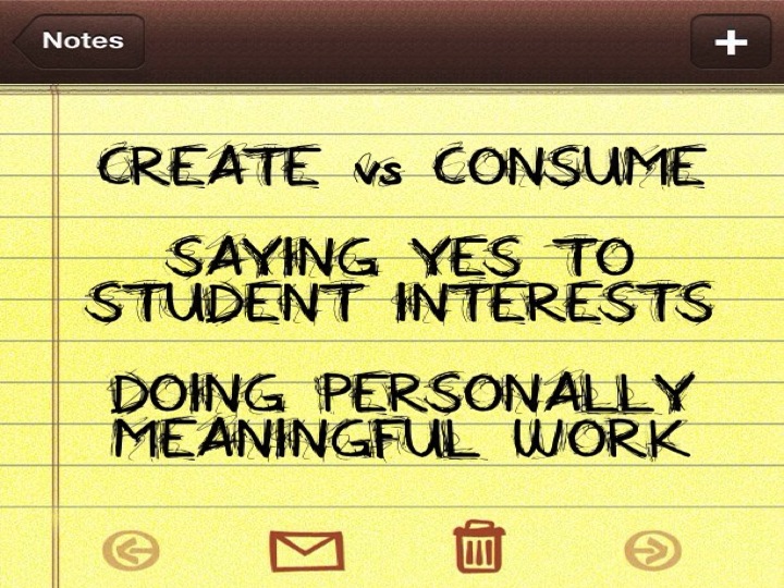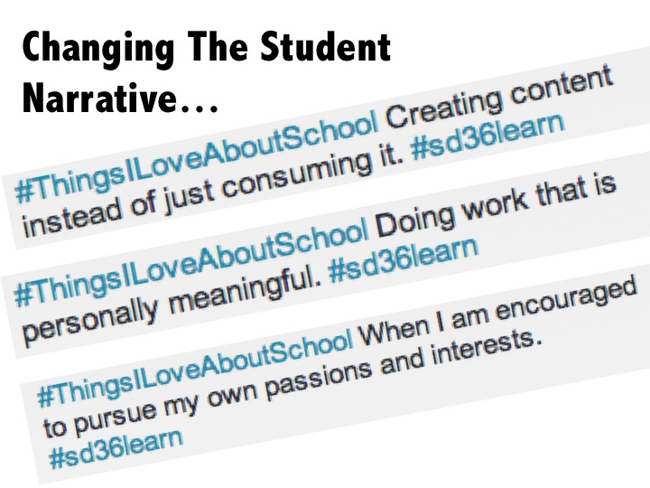 Imagine if we changed what we did in schools and that changed the student narrative. Instead of THINGS I HATE ABOUT SCHOOL trending, students would tweet that they LOVE to create, do work that matters, and follow their passions. Imagine!Do it! Take the risk! Be the change and most importantly, take your students and those you work and learn with everyday along for the ride! Our KIDS depend on it! Thank you!